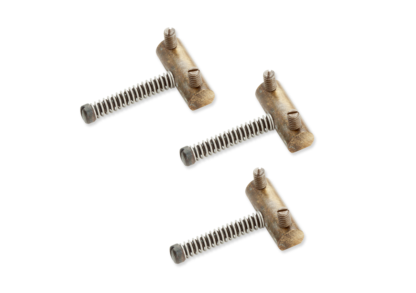 Hand-machined from the best brass alloy, the Antiquity 50s Brass Bridge Saddles are made to bring out great sustain and the fullness of each note. These saddles are aged like they’ve been played for many decades. The intonation screw is a fillister head, and the height adjustment screws are headless, slotted machine screws. The bottoms of the bridge saddles are trimmed to give added height adjustment (up or down). The thee bridge units fit standard bridge specifications.