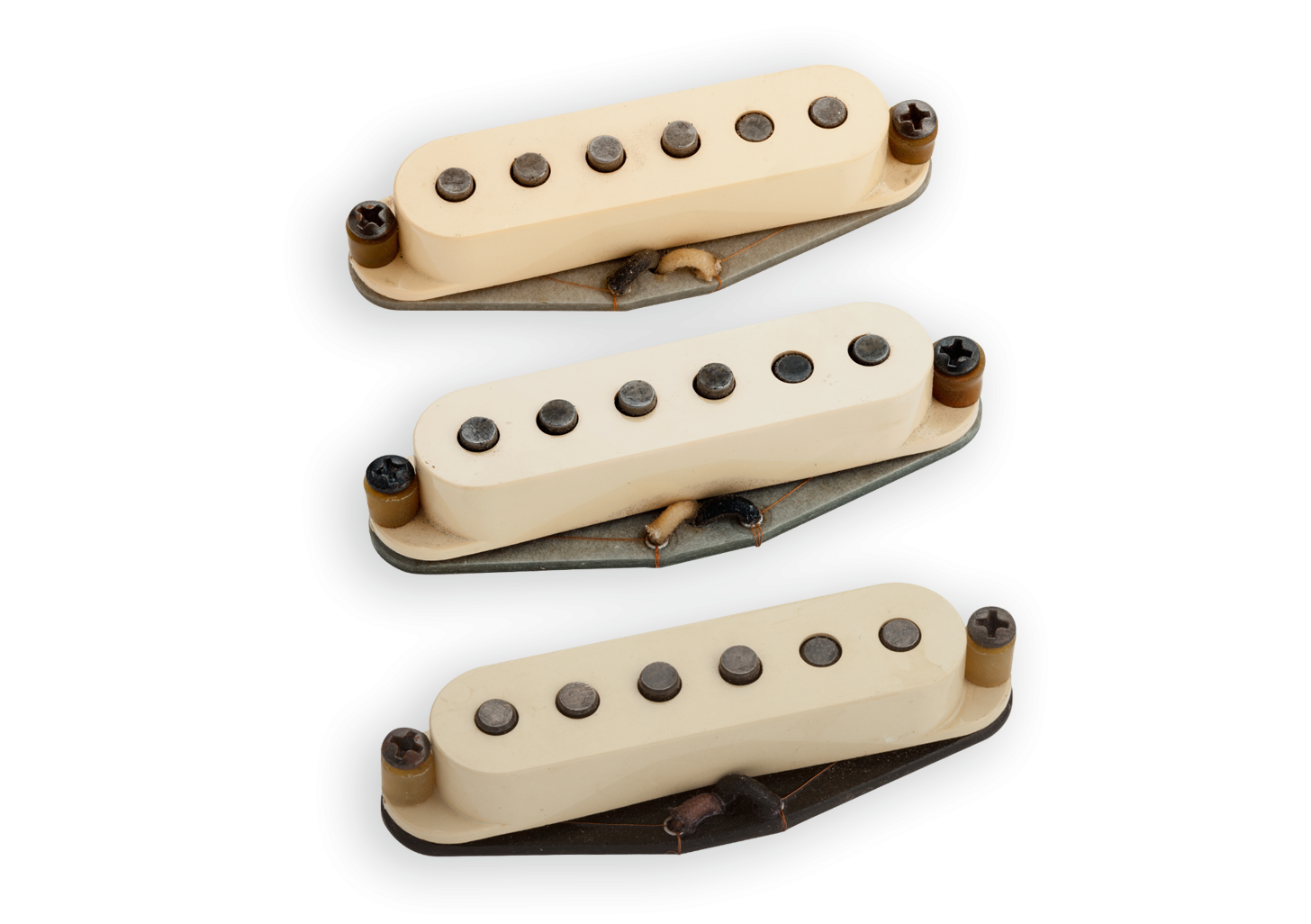Hand-built in our Custom Shop, each pickup is aged to look and sound like a 1960s original. We use vintage correct blue/yellow cloth pushback lead wire, light grey bottom flatwork, and custom-aged covers for just the right look. They are all lacquered and wax potted.