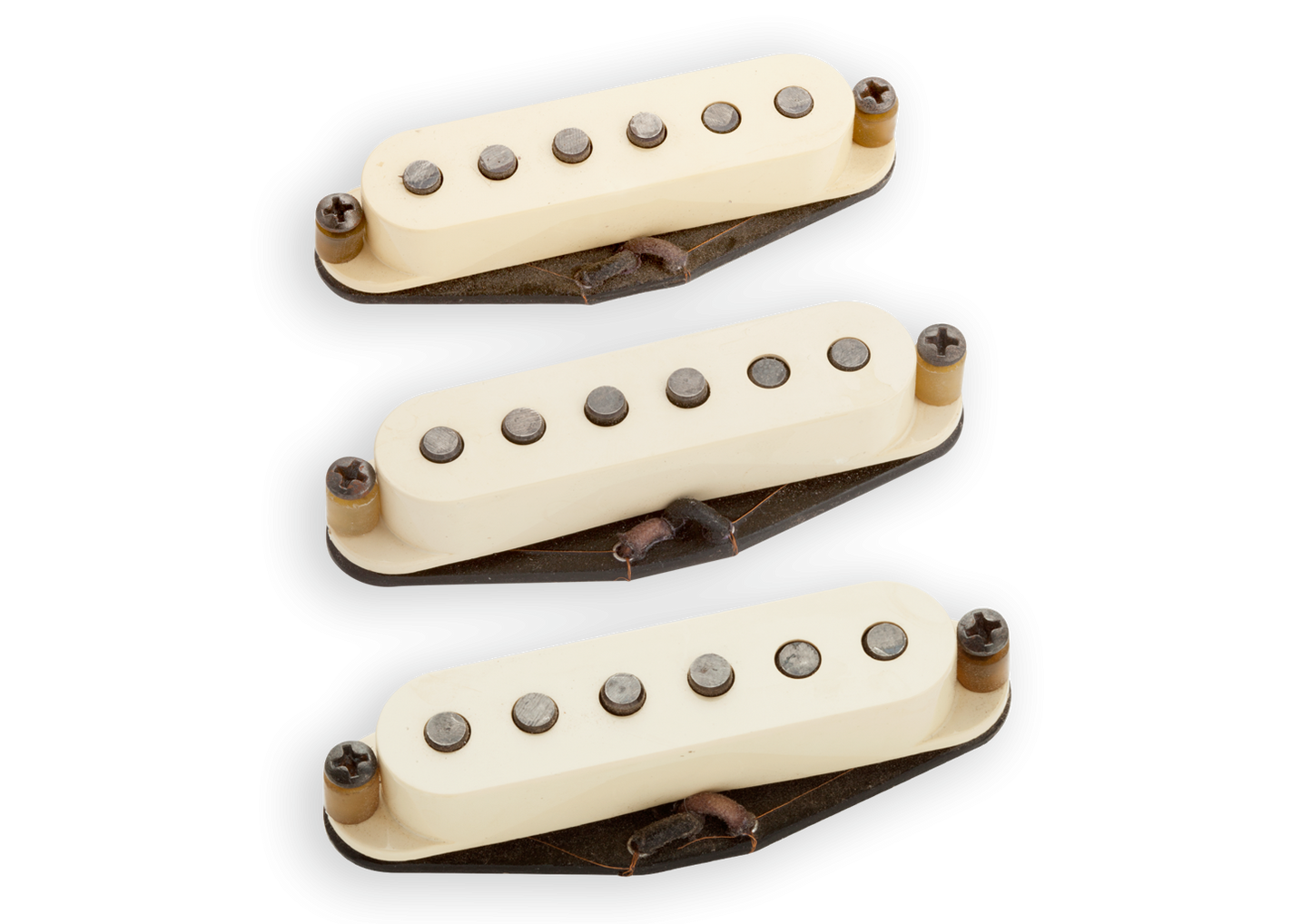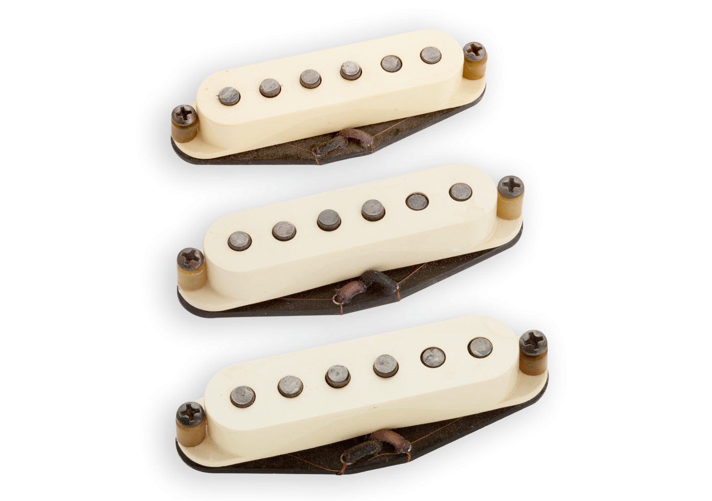 This pickup set is custom-aged both cosmetically and magnetically to simulate the wear and tear that a pickup goes through after decades of playing. Each comes with a specially aged cover, and the individually ground alnico 2-rod poles are specifically calibrated to deliver just the right combination of chime and sweetness. Each is lacquered and potted in lamp black paraffin wax, like the originals.