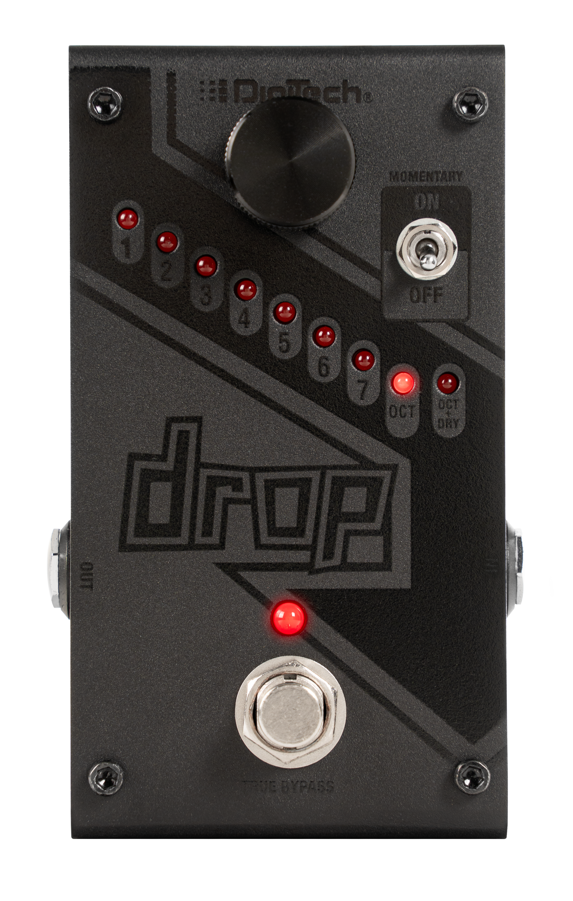 The DigiTech® Drop is a dedicated polyphonic drop tune pedal that allows you to drop your tuning from one semitone all the way down to a full octave. Get down-tuned chunk without having to change guitars! The Drop also features a momentary/latching switch. With the switch set to momentary, you can turn the Drop into a true performance pedal. Fast trills and roller-coaster pitch dips are at the tip of your toes.