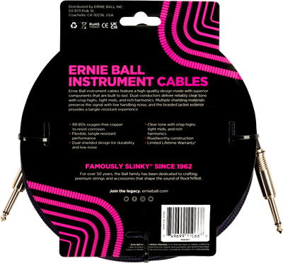 Ernie Ball instrument cables feature a high-quality design made with superior components that are built to last. Dual-conductors deliver reliably clear tone with crisp highs, tight mids, and rich harmonics. Multiple shielding materials preserve the signal with low handling noise, and the braided jacket exterior provides a tangle-resistant experience. Cable length 25ft (7.62m).