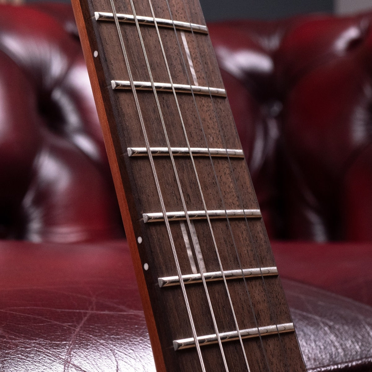 Hard-Nickel Med-Jumbo Frets • Lined Fret Markers • Dot Side Markers • Synthetic Bone Nut • Fixed Bridge • String-Through-Body • 6-Way Chrome Saddles,Staggered Height • Locking Machineheads • ABS Scratchplate Black 3-ply • Flush Fitting Chrome • String Ferrules • Chrome Strap Buttons.
