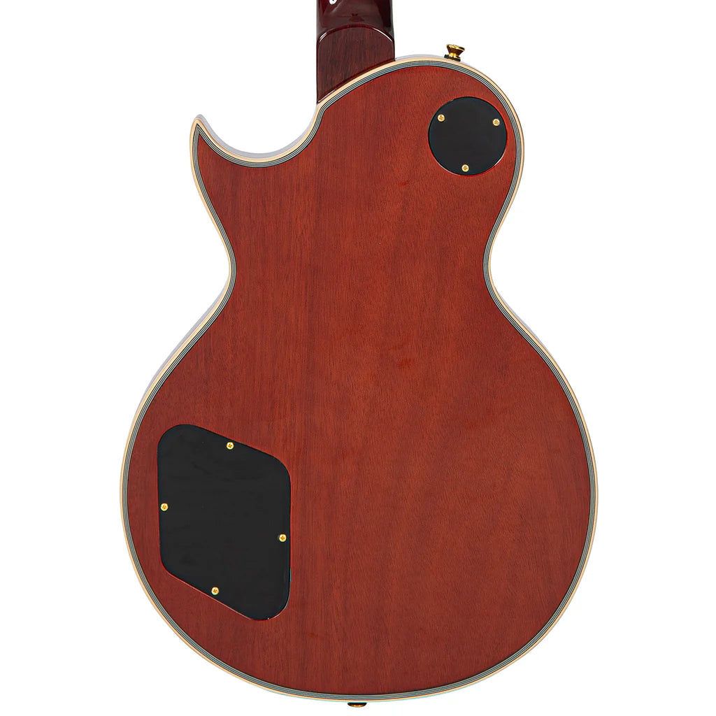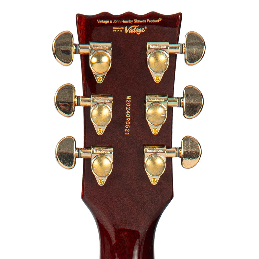 Two piece centre jointed mahogany body, with carved solid maple cap and bookmatched flame maple veneer provides resonance, tone and ‘correct weight’ comfort. The Vintage V100-30TH features a unique, evolutionary body shape, with a graceful descending bass side shoulder and an ingeniously-designed offset heel providing improved access to the upper reaches of the fretboard.