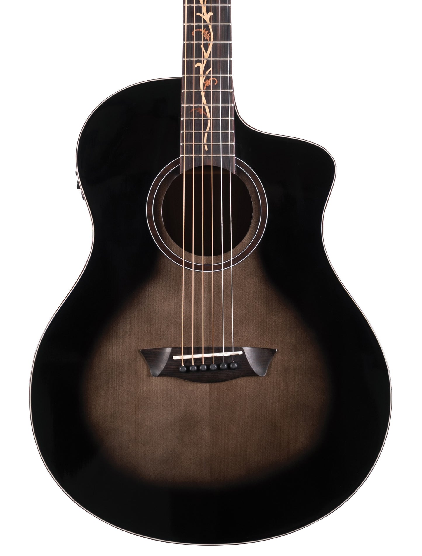 At first glance, the Bella Tono S9V is an obvious pairing to the S9 boasting the same eye-catching high gloss charcoal-burst Spruce top and figured Walnut back & sides. The S9V differs in that it features a cutaway body design, the Barcus Berry LX4 pickup system for amplified possibilities and a breath-taking exotic-wood vine inlaid Ebony fingerboard. The Washburn Studio body design makes for an incredibly comfortable playing experience while managing to maintain the tight lows, focused mids and clear highs commonly associated with larger body sizes. Its full 25.5″ scale length extends an undeniable familiarity to the player and the satin finished, modern “C” profile of the Okoume neck is smooth and cozy feeling in the hands.