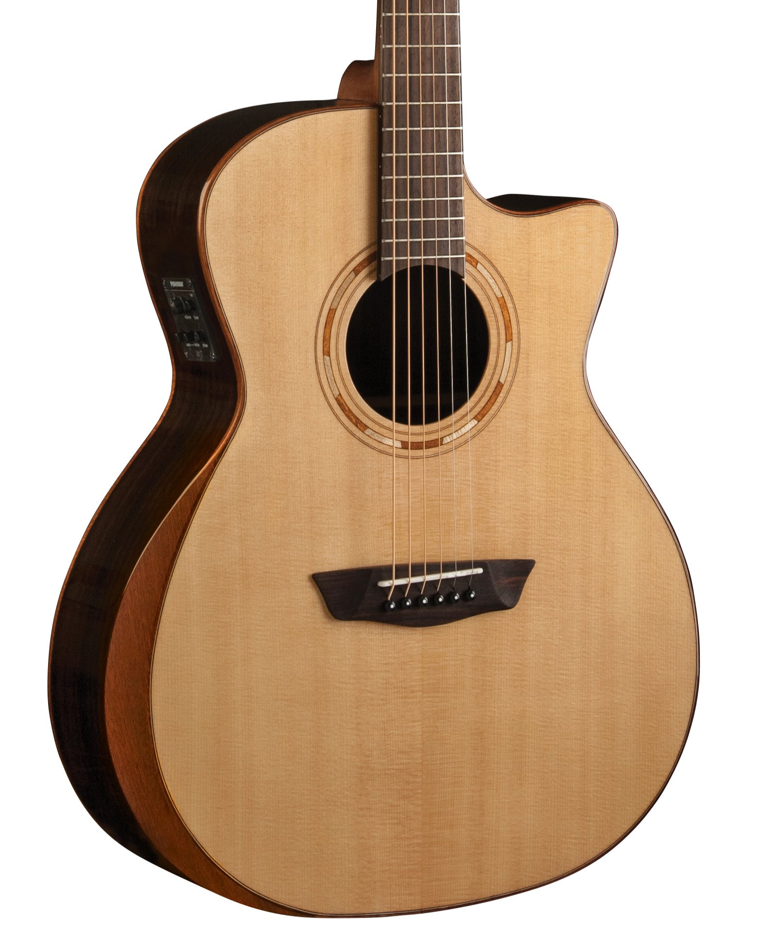 The G20SCE is a Grand Auditorium style acoustic/electric guitar that features a book matched solid Sitka spruce top whose tone will improve with age, supported by Quarter Sawn Scalloped Sitka Spruce bracing, Pau Ferro back and sides, a cutaway for superior upper fret access and premium Fishman Presys II 301T electronics for natural amplified acoustic tone. The unique feature of this model is the mahogany ergonomic armrest bevel binding on the lower bout that provides the comfort the series gets its name from by removing the harsh angle that would normally cut into your forearm. Other features are the mahogany neck with Ovangkol fingerboard and bridge.