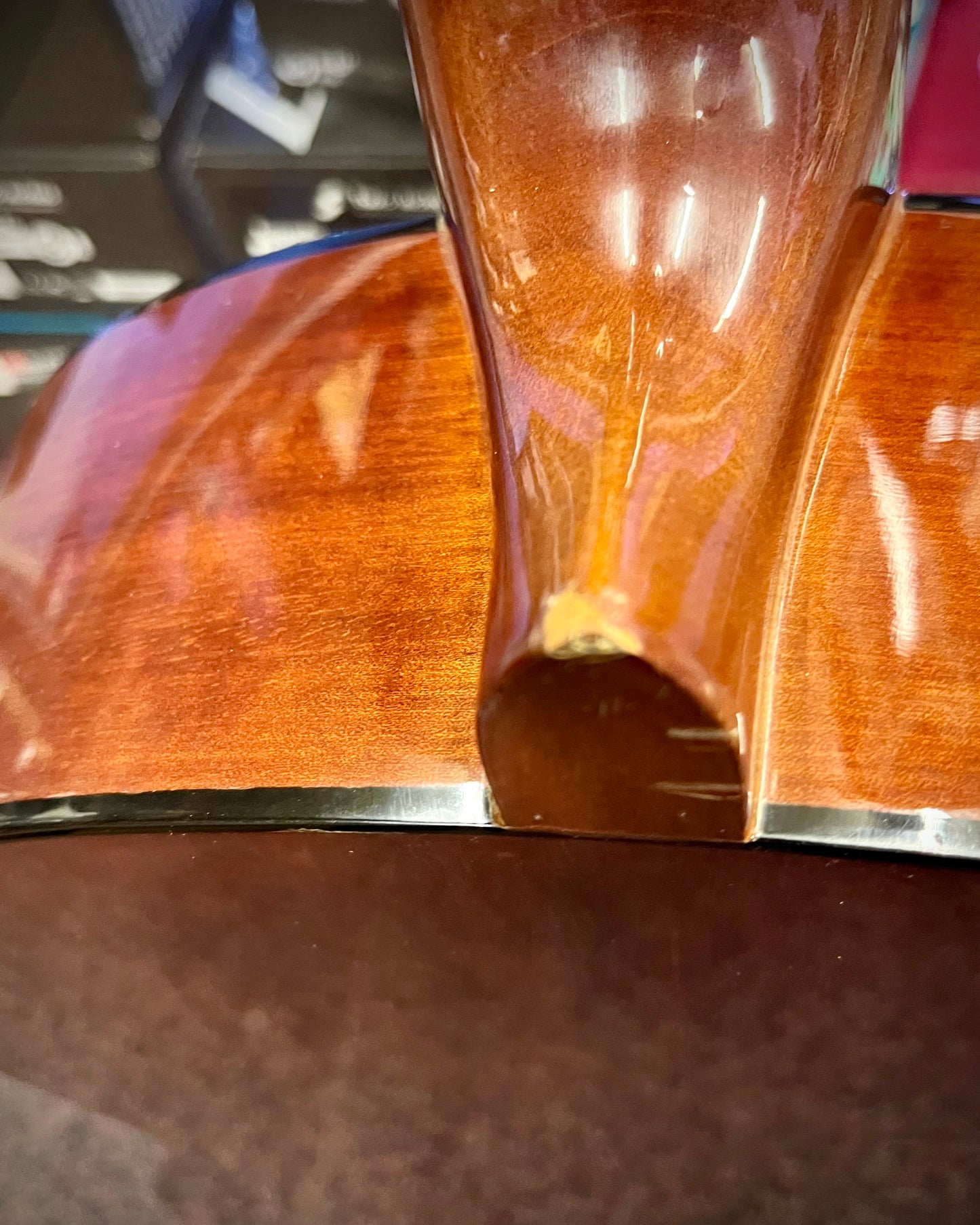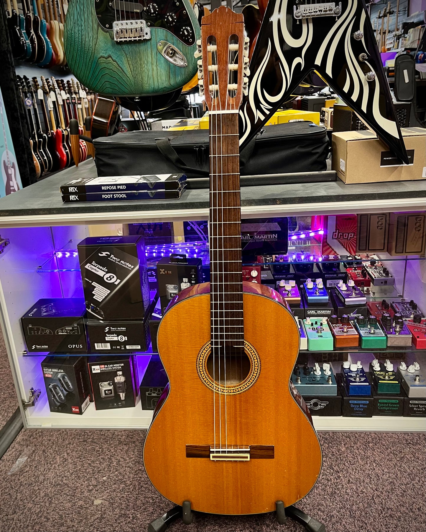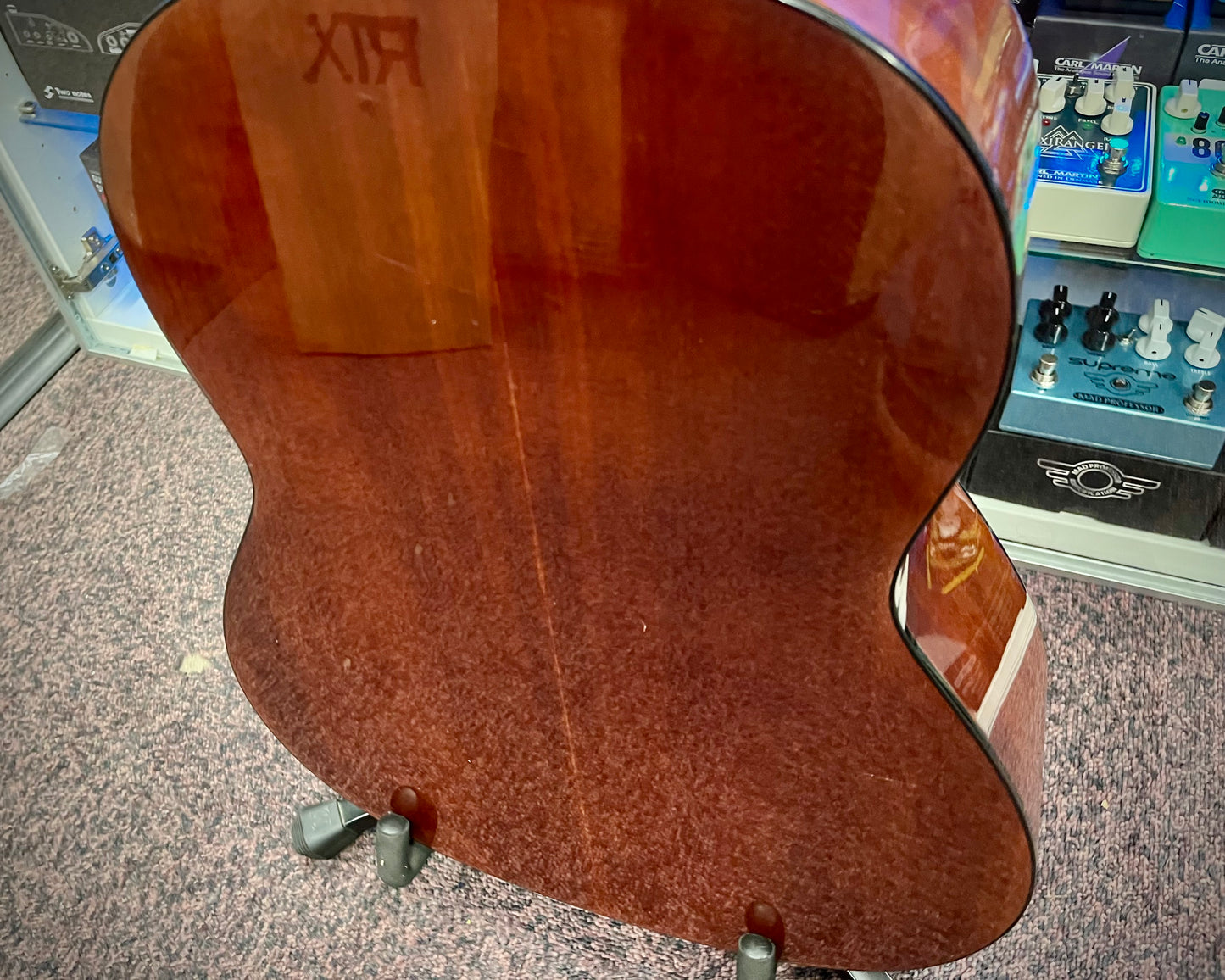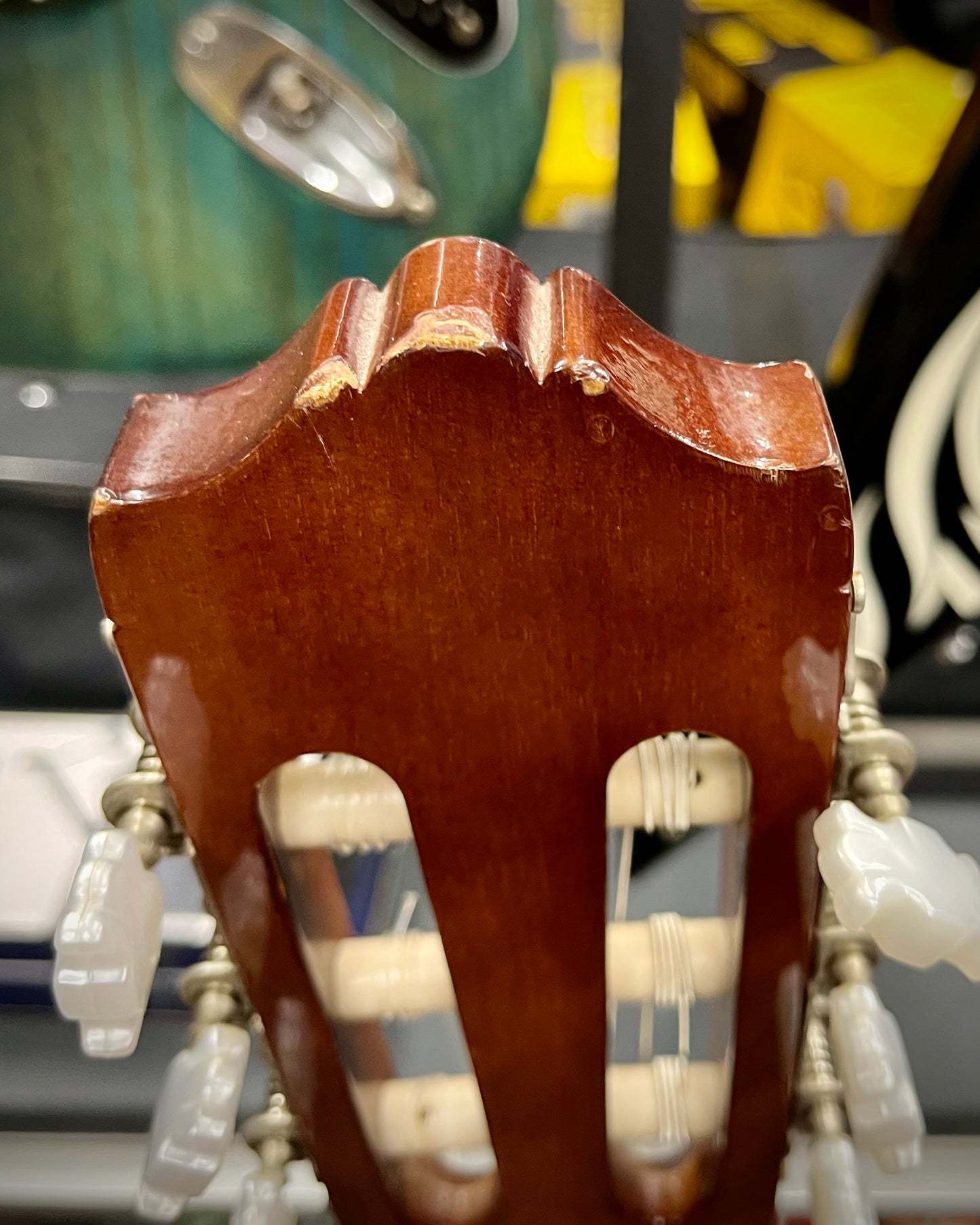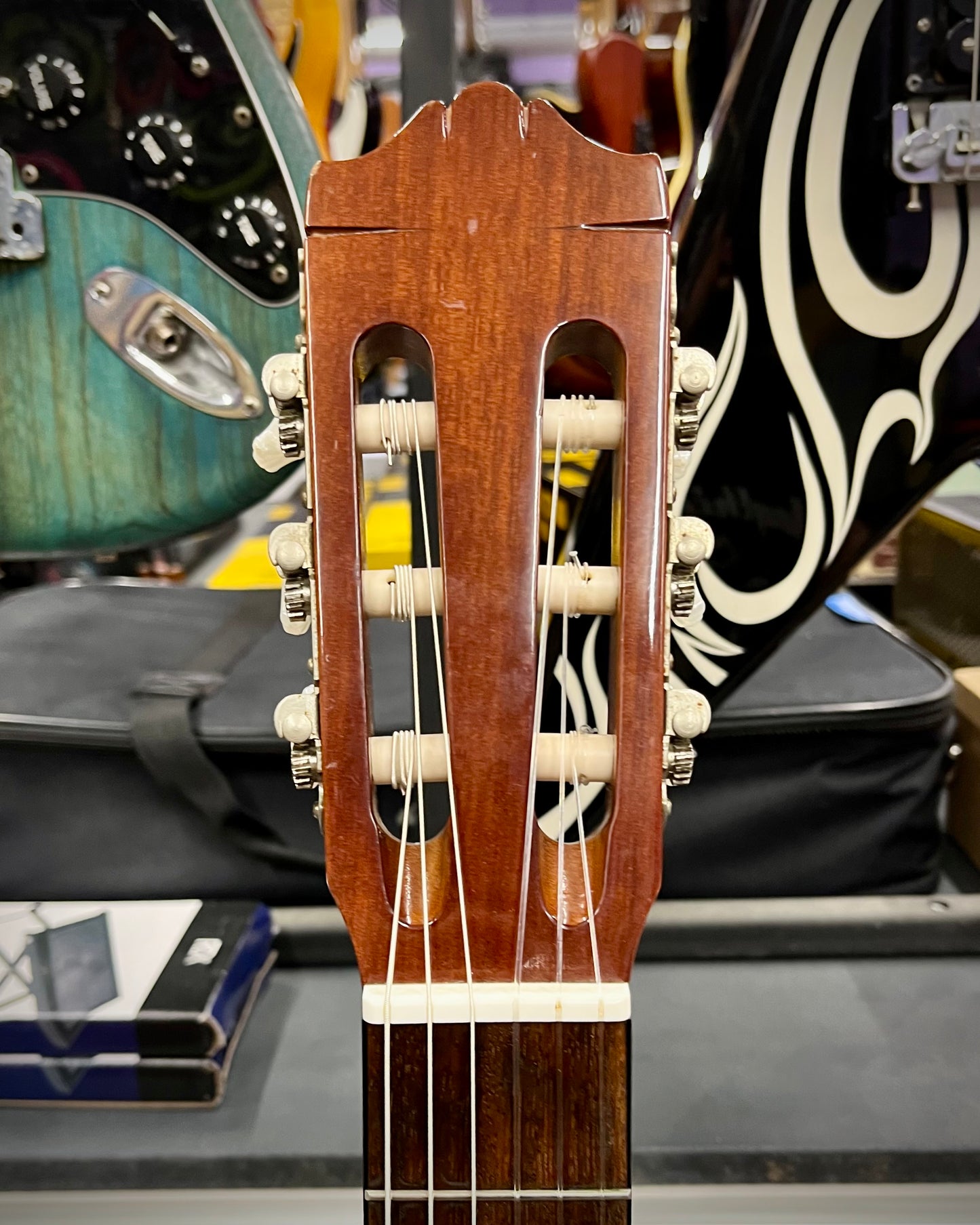 Some cosmetic scuffs and marks. Plays really nicely. Great for a new player or someone looking to try nylon strung guitars!